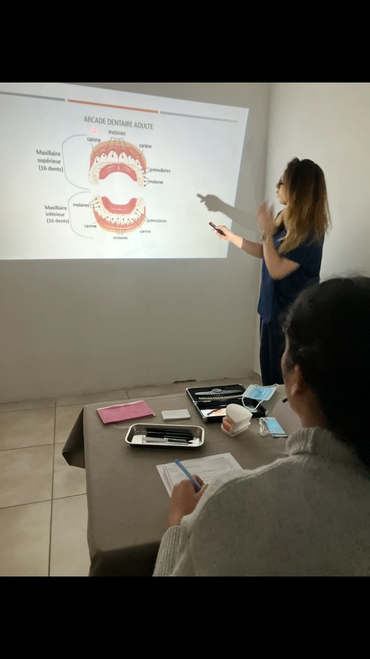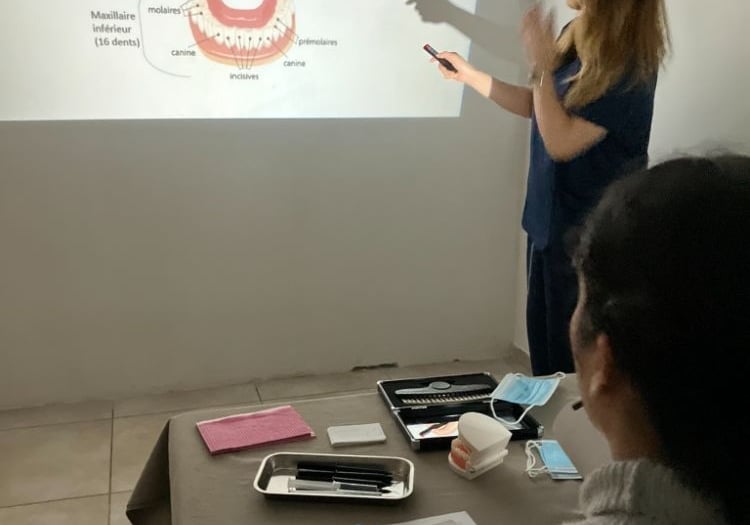 Il s’agit d’une formation intensive d’une journée, avec une partie théorique et une partie pratique ( sur un modèle dentaire et puis sur une personne réelle).