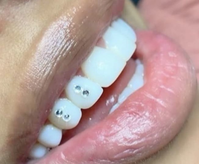 Blanchiment dentaire et strass pour un sourire éclatant.